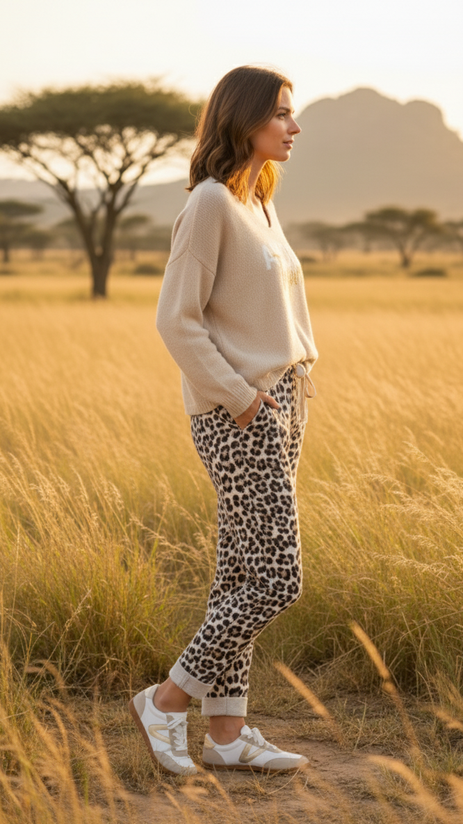 Ajoutez une touche sauvage et confortable à votre garde-robe avec le pantalon Féline Décontractée. Son imprimé léopard audacieux est parfait pour affirmer votre style tout en restant à l’aise. Confectionné en taille unique (jusqu'au 40), il offre une coupe fluide et une ceinture ajustable qui s’adapte à toutes les morphologies. Fabriqué avec 95 % de coton et 5 % d'élasthanne, il allie douceur et élasticité pour un confort optimal. Que ce soit pour une tenue décontractée ou une allure chic, ce pantalon deviendra rapidement un incontournable de votre dressing.